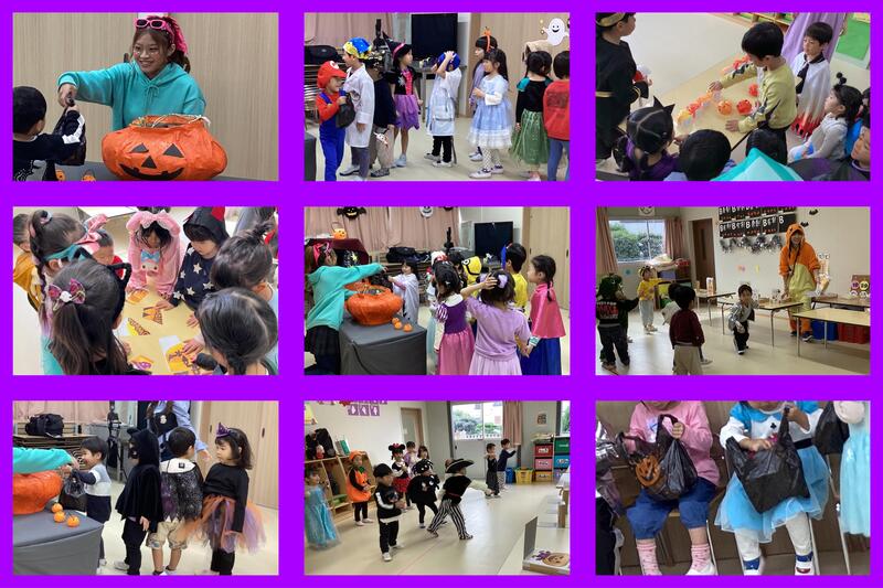 年少組は的当てゲーム、年中組はパズルゲーム、年長組は文字並び替えゲームをし、最後にホールでお菓子をもらいました。